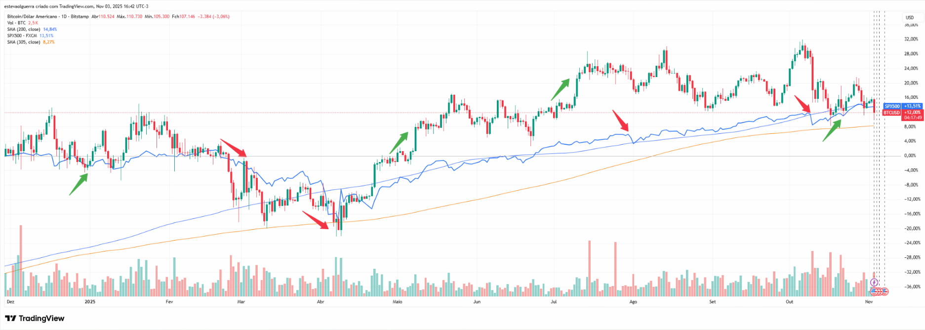 Entretanto, a equipe liderada por Felipe Mendes, CEO da Altside, aponta que há uma correlação significativa entre o índice da NYSE e o preço do bitcoin (imagem abaixo), reforçando a tese sobre a influência macroeconômica na cripto.