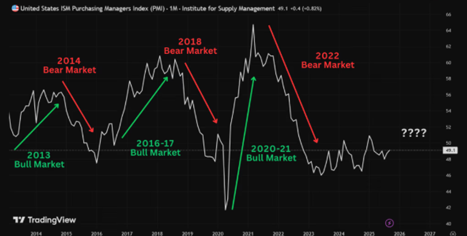 Ao analisar o mercado, a aversão ao risco está entre os motivos para a queda das criptomoedas. Utilizando o ISM PMI (métrica comum para avaliar o ciclo de negócios), a consultoria explica que o mercado tende a arriscar mais quando ele está acima de 50 (expansão) e acelerando.