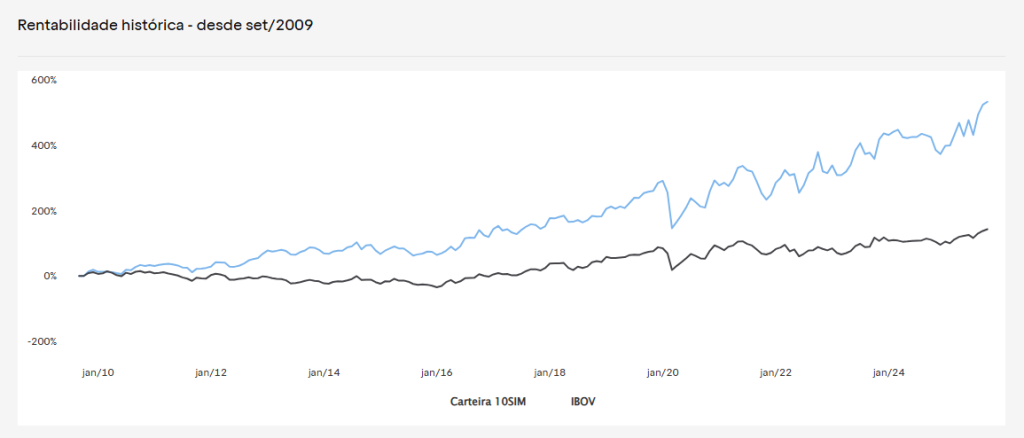 Desde a gestão iniciada por Carlos E. Sequeira em 2009, a carteira registra um ganho acumulado de 532,8%, também superando a valorização do Ibovespa (143,1%) e do IBrX-50 (188,5%). Veja abaixo: