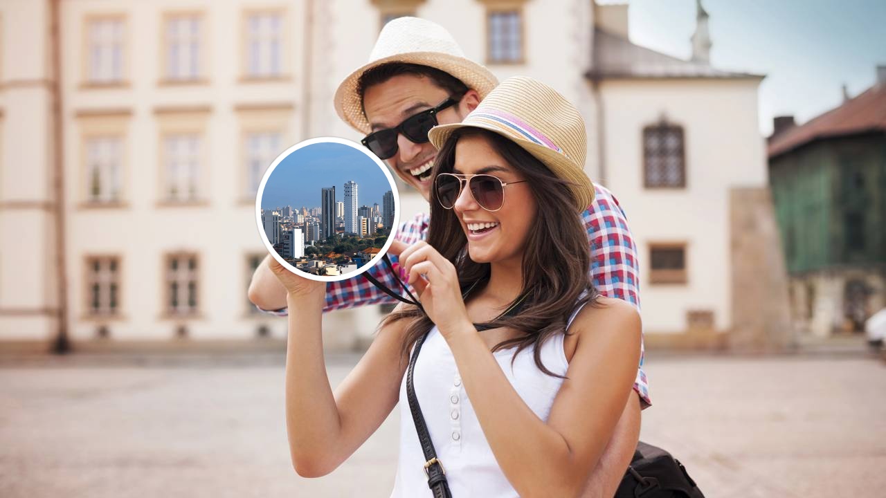 Casal fofo olhando fotos de Sorocaba na câmera e Centro de Sorocaba, Brasil, Sorocaba é a oitava maior cidade do estado de São Paulo - Créditos: depositphotos.com / gpointstudio - Créditos: depositphotos.com / snehitdesign