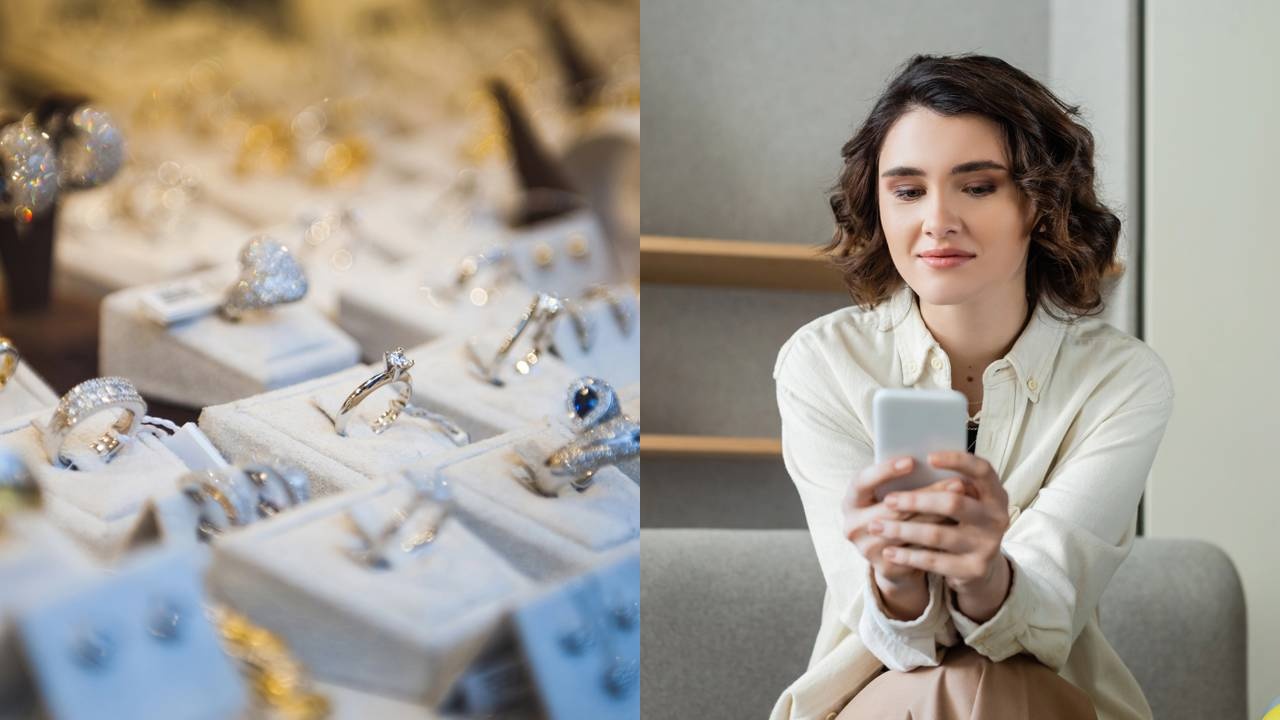 Mulher jovem e sorridente, de cabelos castanhos, usando smartphone enquanto está sentada em um sofá perto de uma mala de viagem, com prateleiras de livros e um vaso de flores ao fundo desfocado e Vitrine de joalheria - Créditos: depositphotos.com / ifeelstock - Créditos: depositphotos.com / IgorVetushko