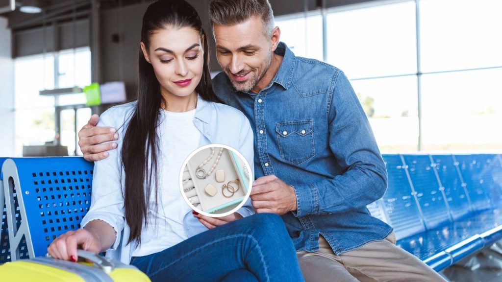 Homem e mulher sentados usando smartphone no aeroporto e joias estilosas em fundo branco – Créditos: depositphotos.com / AllaSerebrina – Créditos: depositphotos.com / serezniy