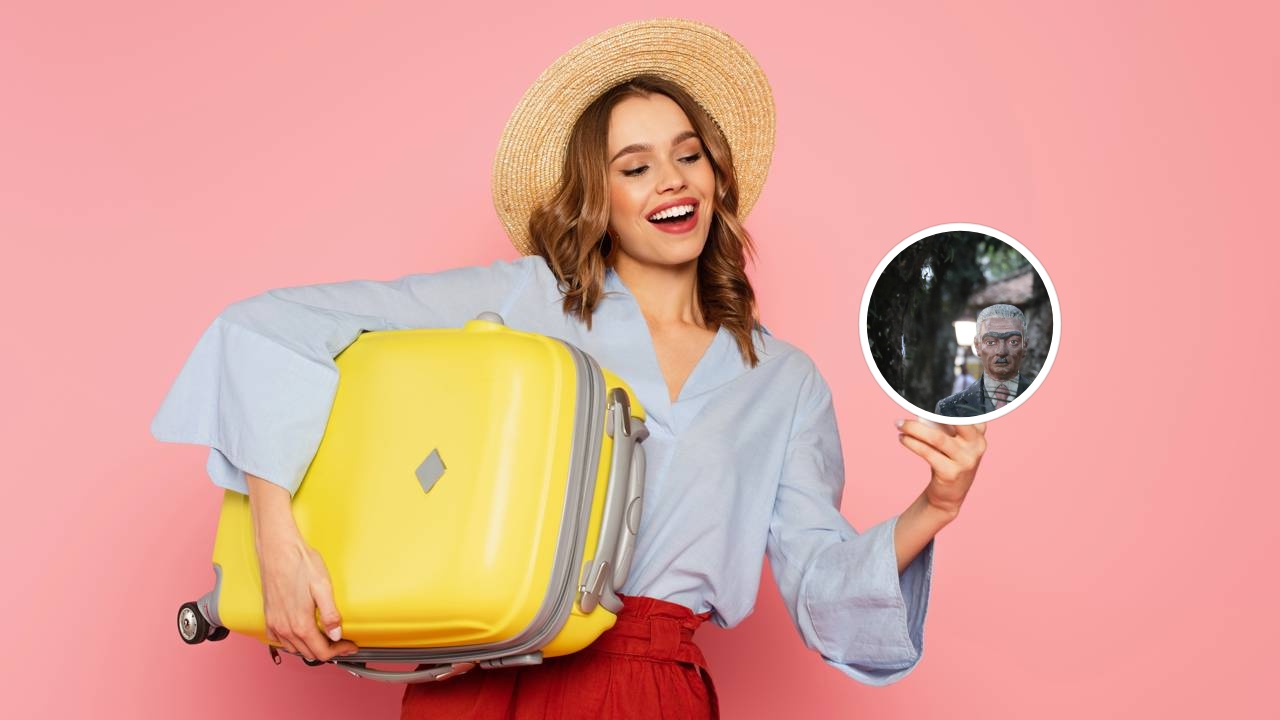Mulher sorridente com mala usando smartphone isolada em fundo rosa e estátua de Monteiro Lobato, escritor brasileiro, de autoria desconhecida, no Parque do Pica-Pau Amarelo, Sítio do Pica-Pau Amarelo, Taubaté, Brasil - Créditos: depositphotos.com / IgorVetushko - Créditos: depositphotos.com / jprlpco.gmail.com