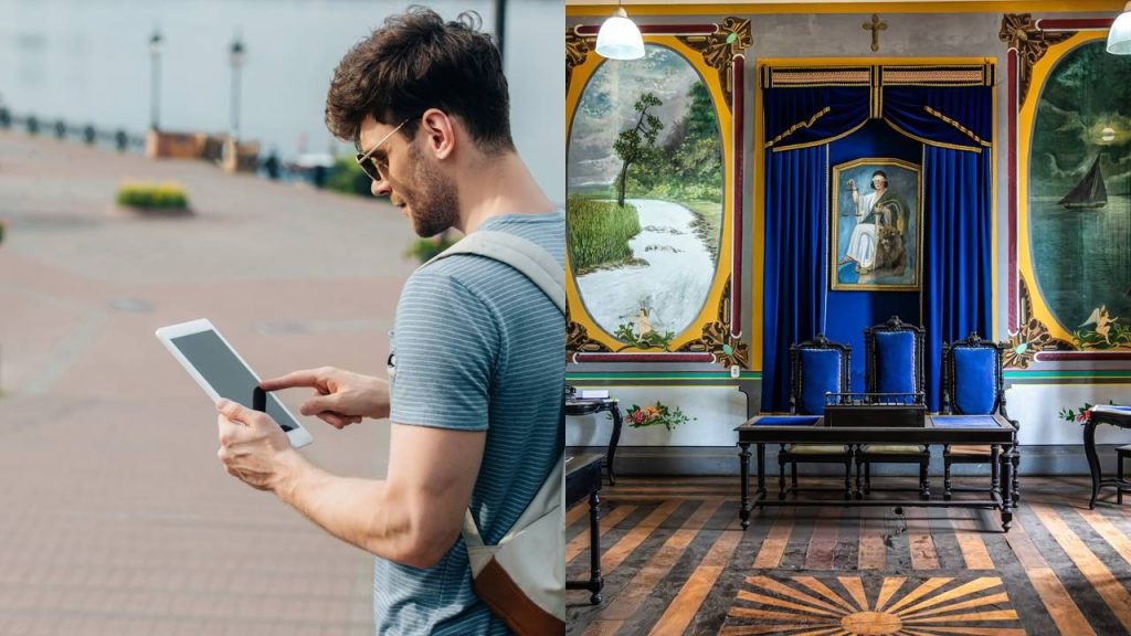 Homem bonito de óculos com mochila usando tablet digital e Centro Cultural João Fona em Santarém, Brasil. Museu que possui cerâmicas arqueológicas e outras peças históricas de Santarém – Créditos: depositphotos.com / RudiErnst – Créditos: depositphotos.com / HayDmitriy