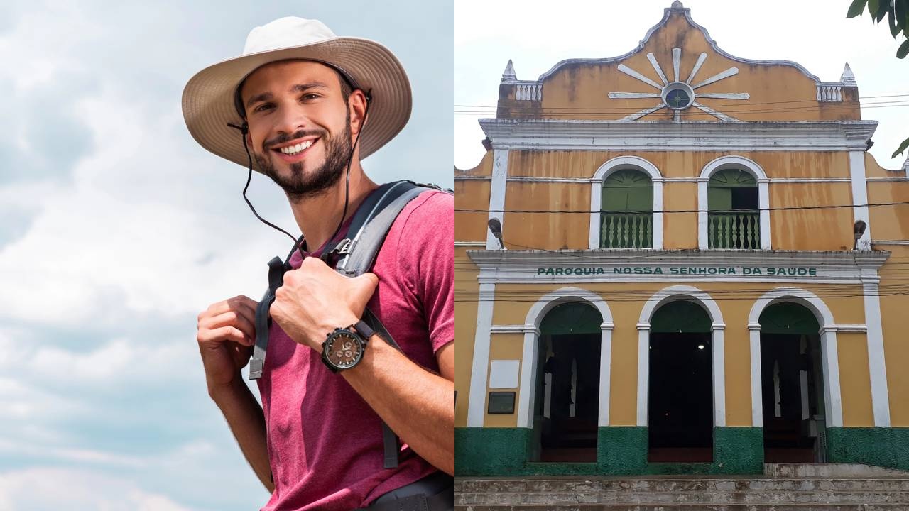 Igreja Paroquial de Nossa Senhora da Saúde, no centro de Alter do Chão, no estado do Pará e Viajante sorridente de chapéu, com mochila e esteira de turista, tendo como fundo um céu nublado - Créditos: depositphotos.com / AllaSerebrina - Créditos: depositphotos.com / A.Paes