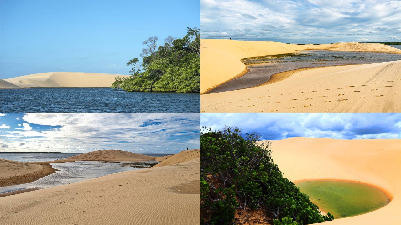 Rio Parnaíba e Dunas do Morro na Ilha do Caju, Ilha das Canárias, Brasil. Delta do Parnaíba e Delta das Américas e Belas dunas e lagoas em Parnaíba, Piauí - Créditos: depositphotos.com / xura - Créditos: depositphotos.com / RudiErnst - Créditos: depositphotos.com / Elena Skalovskaia - Créditos: depositphotos.com / Elena Skalovskaia