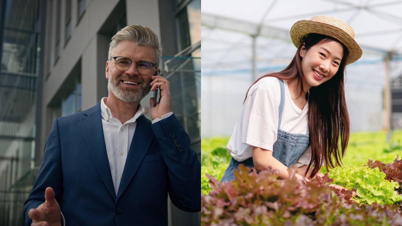 Mulher agricultora inteligente trabalhando e verificando a qualidade de vegetais orgânicos hidropônicos em uma plantação de estufa para a gerência, preparando-os para exportação e Homem de negócios adulto de meia-idade caminhando na cidade, falando ao celular, negociando e investidor sênior - Créditos: depositphotos.com / katcha.natsarin@gmail.com - Créditos: depositphotos.com / jet_po.mail.ru