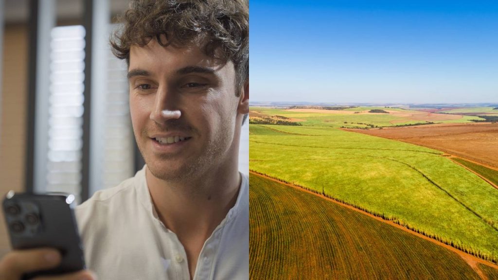 Homem de negócios caucasiano sorridente e feliz caminhando no escritório, olhando para o smartphone e Vista aérea de área rural no Brasil – Créditos: depositphotos.com / gustavofrazao – Créditos: depositphotos.com / jet_po.mail.ru