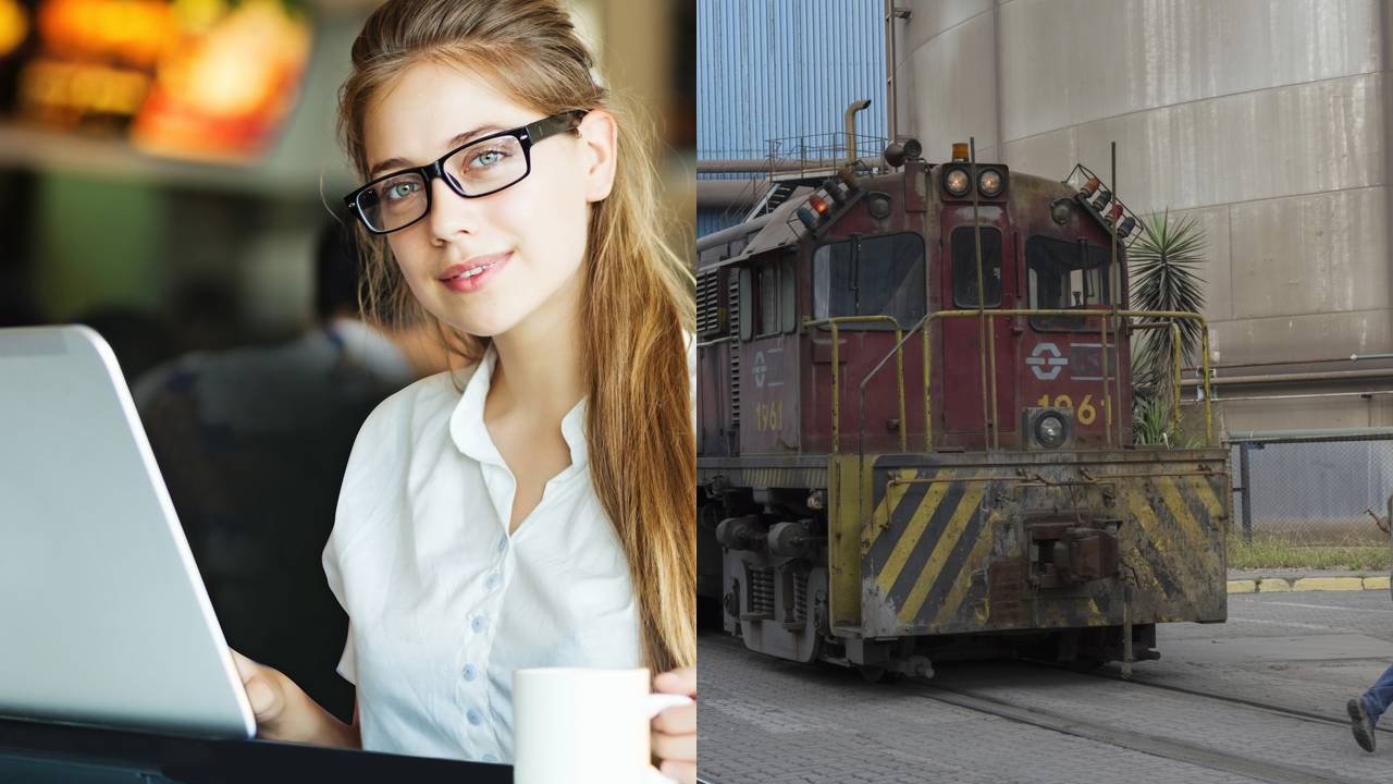Operário metalúrgico caminha dentro da enorme Siderúrgica Nacional, atravessando a rua interna em frente a um trem de carga, Volta Redonda, Rio de Janeiro, Brasil e Mulher com laptop - Créditos: depositphotos.com / rosarenan@hotmail.com - Créditos: depositphotos.com / apid