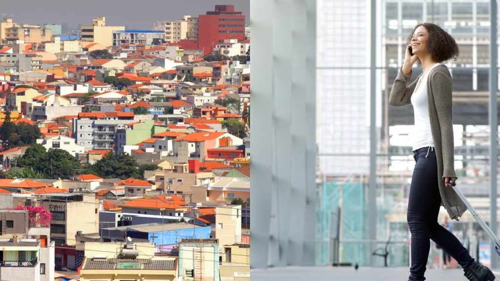 Jovem viajante com celular e mala e cidade São Caetano do Sul – Créditos: depositphotos.com / snehitdesign – Créditos: depositphotos.com / mimagephotos