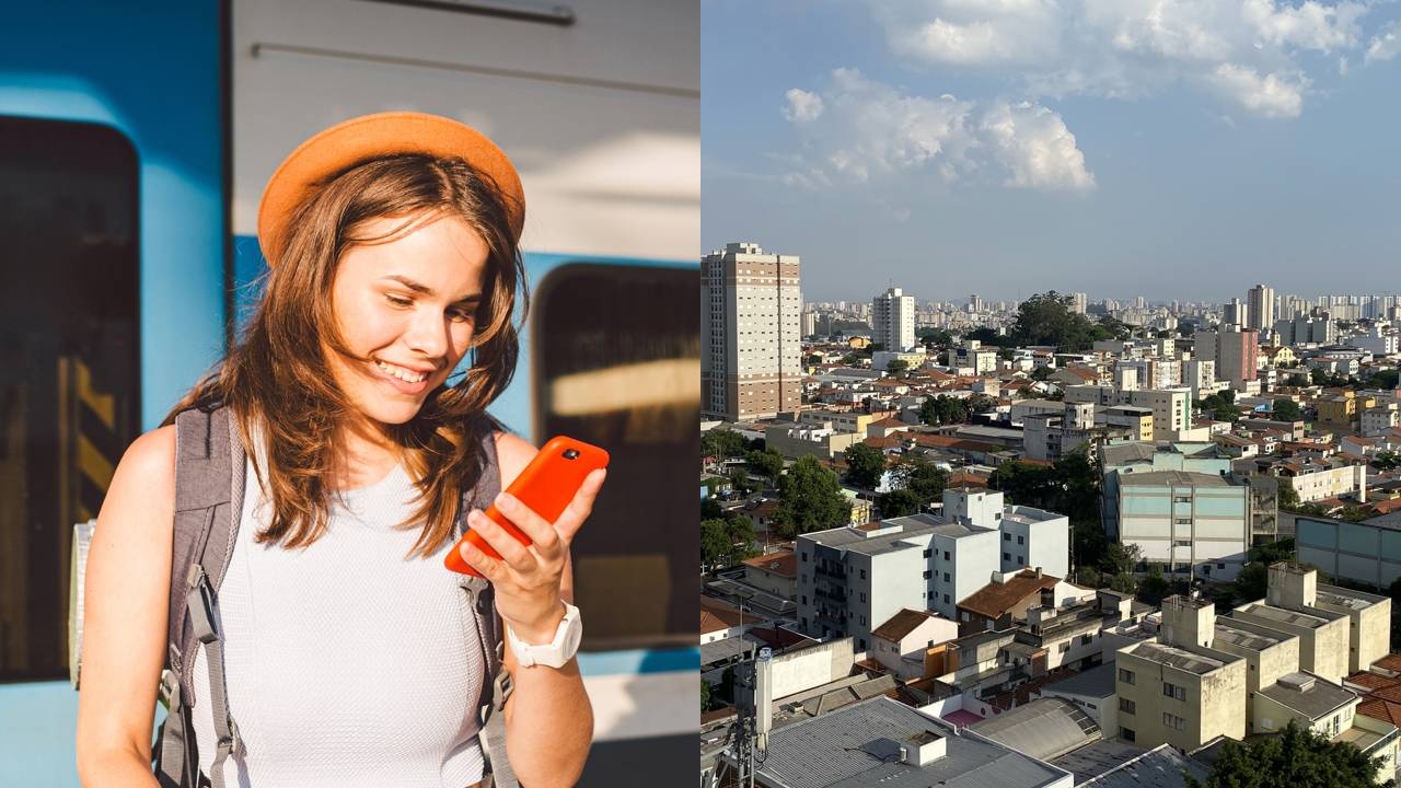 Mulher sorridente usando smartphone na estação. Jovem segurando smartphone e em pé na estação de trem e Paisagem urbana de São Caetano do Sul, Brasil - Créditos: depositphotos.com / luisrftc - Créditos: depositphotos.com / veloliza