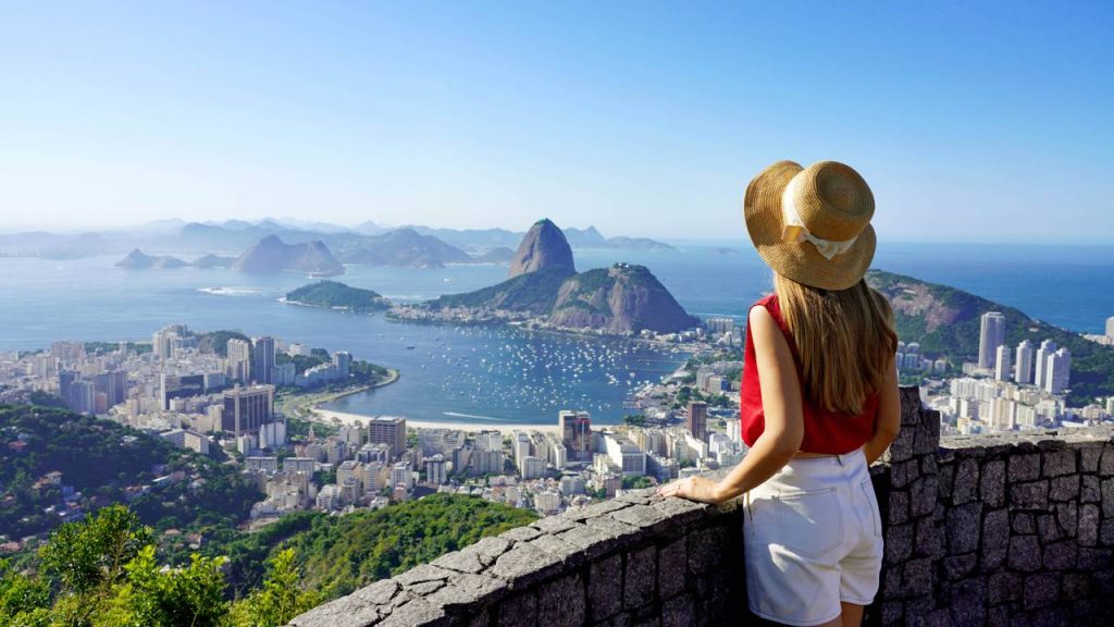 Turismo no Rio de Janeiro. Vista de costas de uma turista apreciando a vista da famosa Baía de Guanabara com o Pão de Açúcar no Rio de Janeiro, Patrimônio Mundial da UNESCO, Brasil – Créditos: depositphotos.com / sergio_pulp
