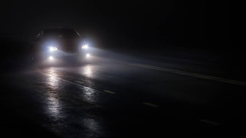 Um BMW esportivo sozinho em uma estrada vazia à noite e com neblina – Créditos: depositphotos.com / lucky_pics