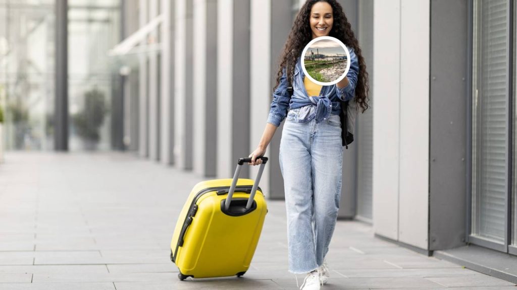 Porto do rio Amazonas durante a maré baixa em Tabatinga e Jovem alegre e bonita do Oriente Médio, com cabelos cacheados e roupas casuais confortáveis, indo passar férias sozinha, caminhando pelo aeroporto com uma mala amarela, usando o celular – Créditos: depositphotos.com / Milkos – Créditos: depositphotos.com / Mirek1967