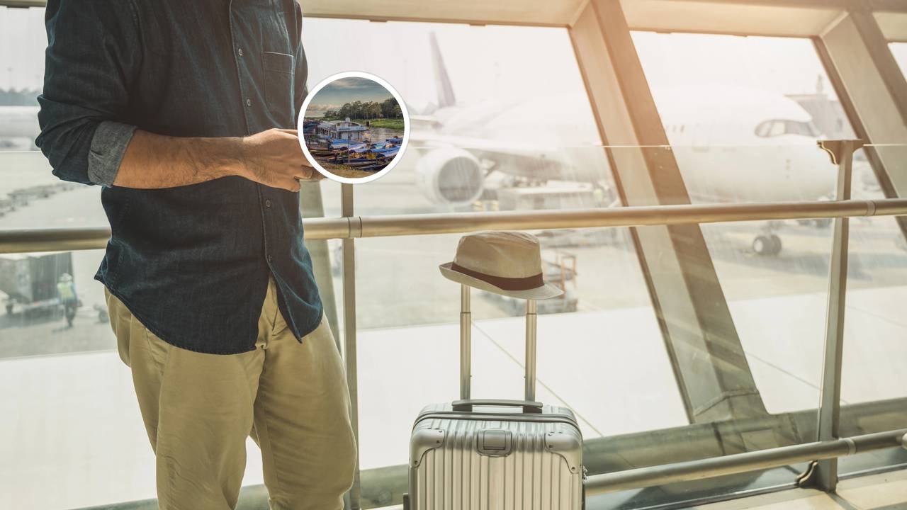 Porto do rio Amazonas durante a maré baixa em Tabatinga e Jovem alegre e bonita do Oriente Médio, com cabelos cacheados e roupas casuais confortáveis, indo passar férias sozinha, caminhando pelo aeroporto com uma mala amarela, usando o celular – Créditos: depositphotos.com / Milkos – Créditos: depositphotos.com / Mirek1967