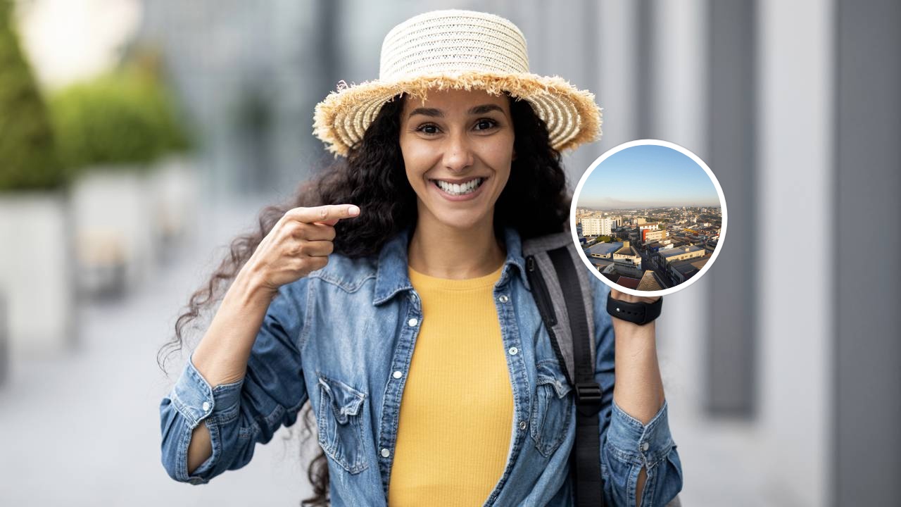 Mulher jovem e alegre, vestida casualmente como turista, caminhando perto do aeroporto, apontando para um smartphone e Imagem aérea do centro de Betim–MG - Créditos: depositphotos.com / Milkos - Créditos: depositphotos.com / contato@ideiasvirtuais.com.br