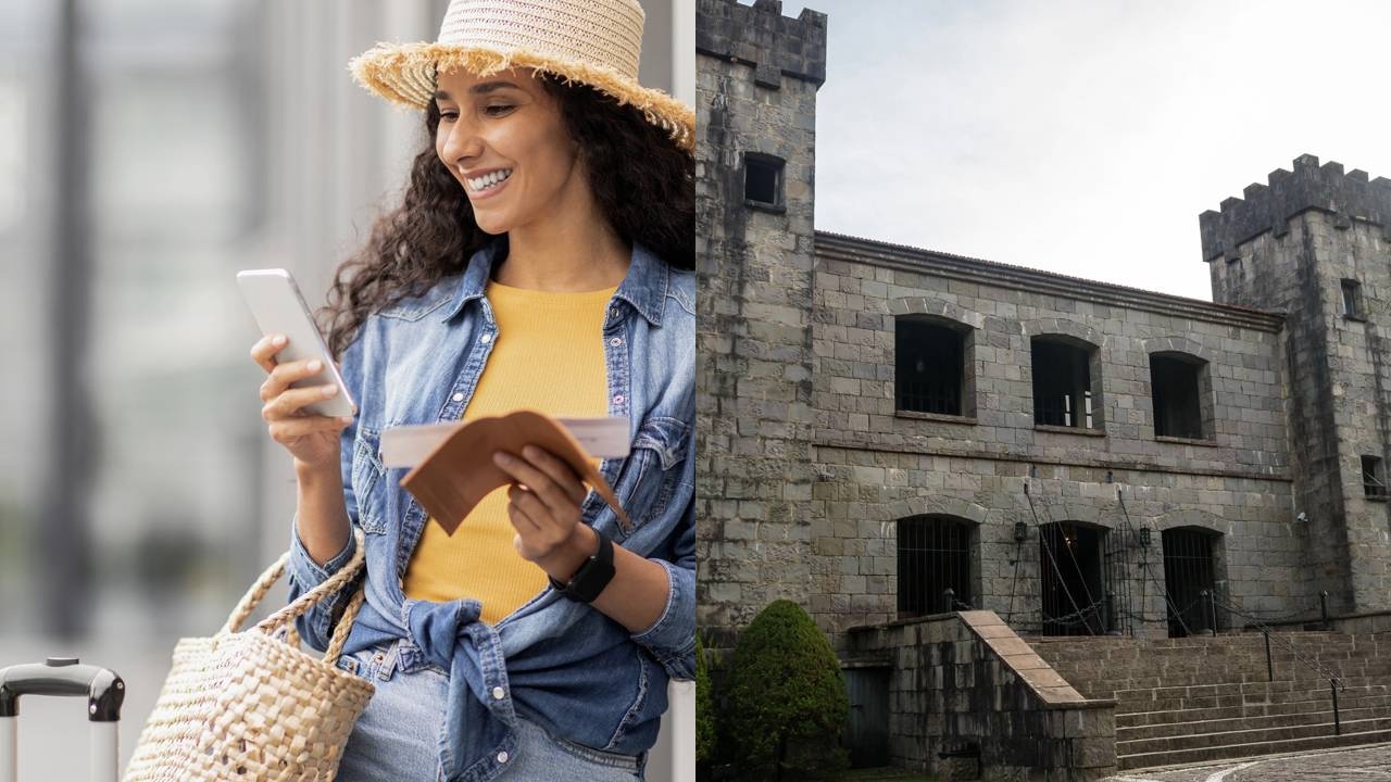 Mulher jovem, de cabelos longos e aparência otimista, típica do Oriente Médio, usando chapéu de palha, em pé perto do aeroporto, carregando uma bolsa de palha e uma mala e Vinícola e restaurante Lacave Castle - Caxias do Sul, Rio Grande do Sul, Brasil - Créditos: depositphotos.com / Milkos - Créditos: depositphotos.com / diegograndi