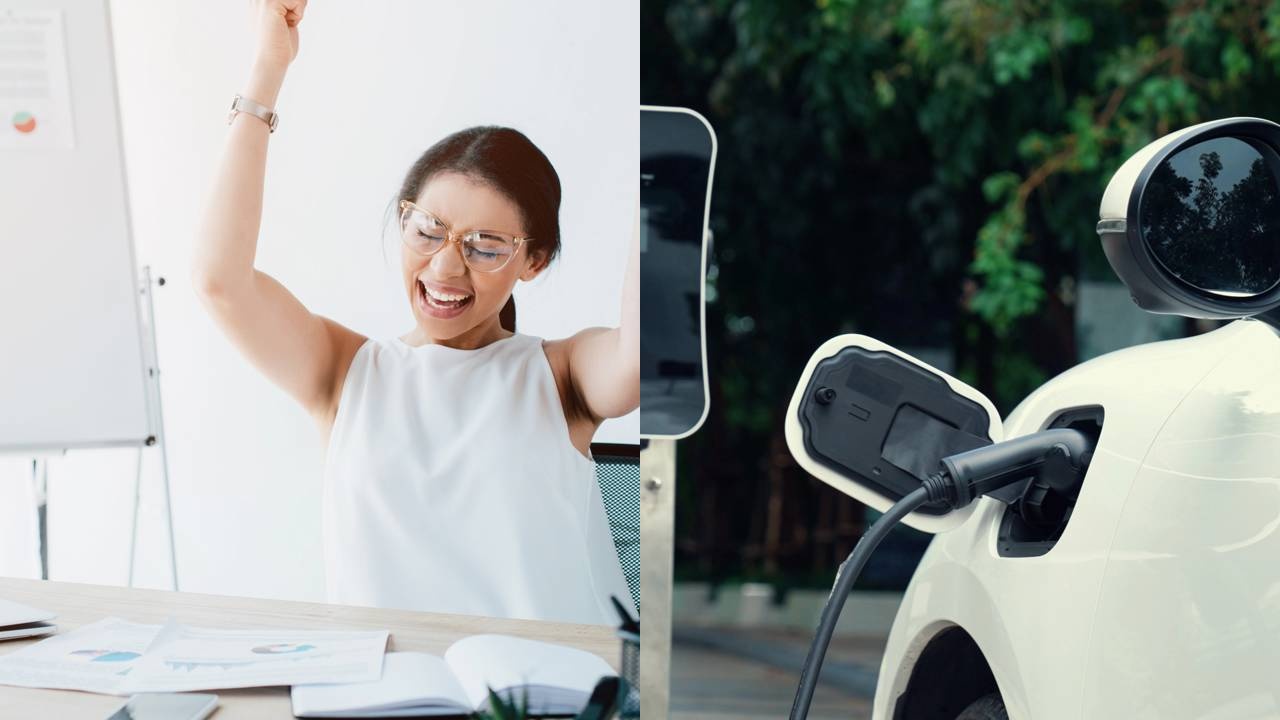 Mulher de negócios animada comemorando o triunfo enquanto está sentada em seu local de trabalho no escritório e recarga de carros elétricos ao lado de estações de carregamento domésticas. Veículo elétrico movido a energia renovável para preservação ambiental - Créditos: depositphotos.com / BiancoBlue - Créditos: depositphotos.com / IgorVetushko