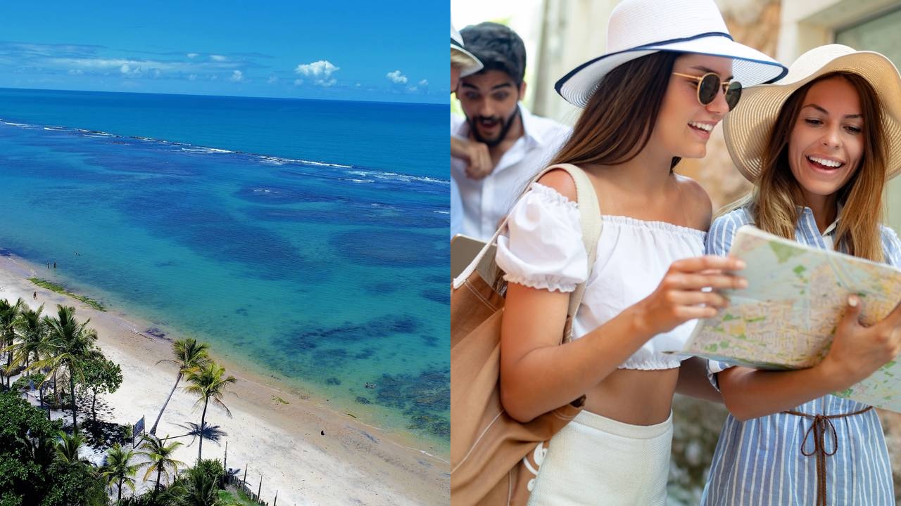 Conceito de turismo, viagens, lazer, férias e amizade - grupo sorridente de amigos com mapa e Arraial d'Ajuda, Porto Seguro, Bahia, Brasil. Praia paradisíaca com tempo bom. Paisagem linda. Cenário de viagem. Cenário de férias. Ponto turístico da Bahia, Brasil. Cenário relaxante - Créditos: depositphotos.com / Cristian_Lourenco - Créditos: depositphotos.com / nd3000