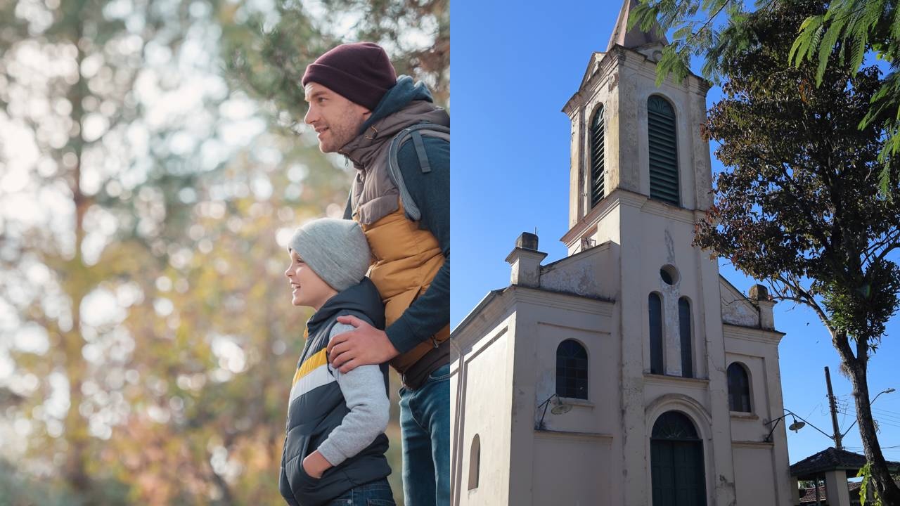 pai e filho caminhando juntos e Igreja Nossa Senhora da Piedade igreja de Nossa Senhora da Piedade em Pedrinhas, Guaratingueta, São Paulo. Foto de alta qualidade - Créditos: depositphotos.com / jprlpco.gmail.com - Créditos: depositphotos.com / alebloshka