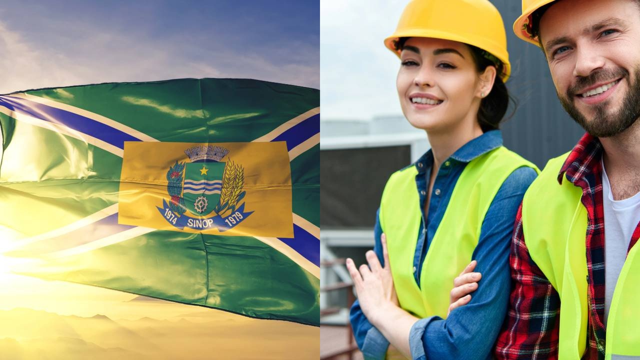 Bandeira de Sinop do Brasil tremulando no topo, neblina ao nascer do sol e engenheiros profissionais com capacetes e coletes de segurança no telhado - Créditos: depositphotos.com / AllaSerebrina - Créditos: depositphotos.com / AleksTaurus