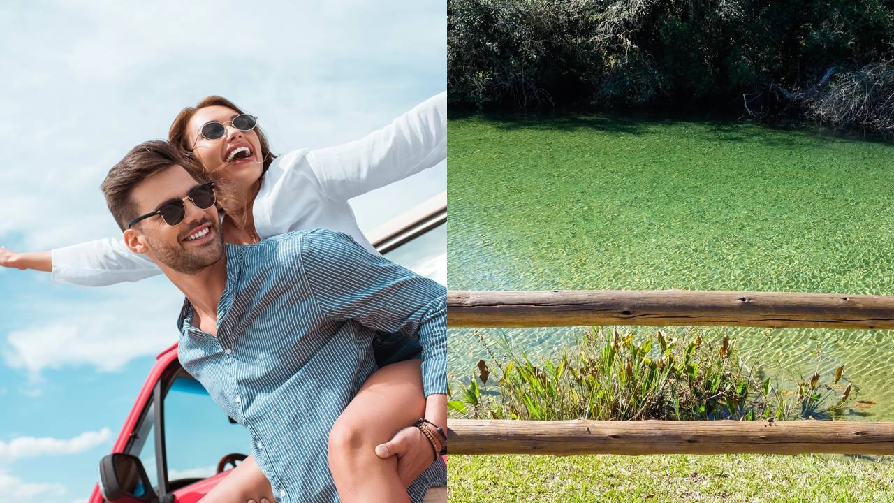 A Lagoa Dourada no Parque Estadual Vila Velha, Ponta Grossa, Paraná, Brasil e Casal jovem e animado de viajantes nas costas de um carro - Créditos: depositphotos.com / AllaSerebrina - Créditos: depositphotos.com / caio.acquesta@gmail.com