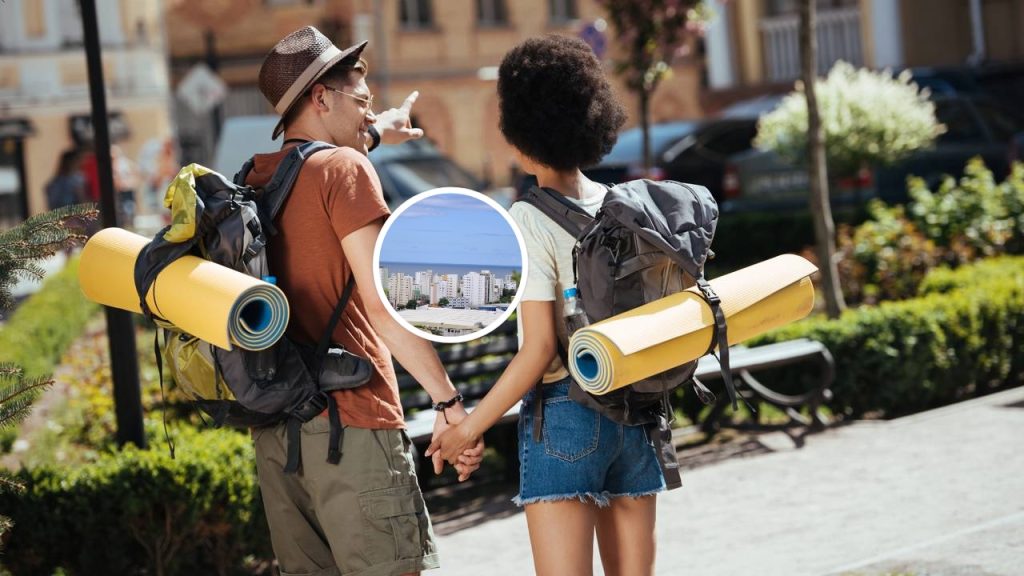 Homem viajante com mochila e colchonete apontando com o dedo para a namorada e cidade – Créditos: depositphotos.com / galluccio – Créditos: depositphotos.com / VitalikRadko