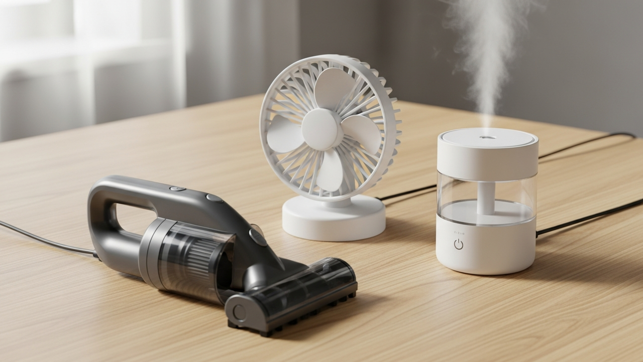 Entre os mais comuns estão mini aspiradores, ventiladores compactos e mini umidificadores, todos adequados para uso em escritórios, home office e viagens.