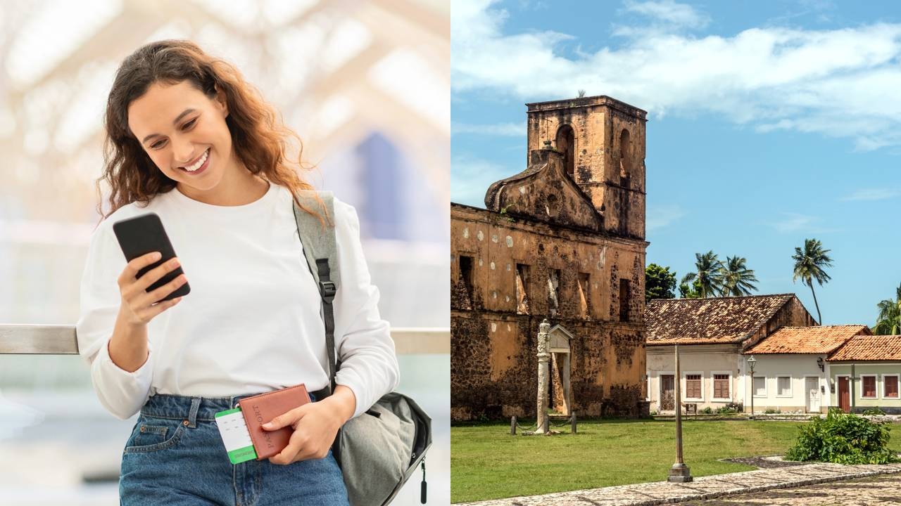 Uma mulher alegre concentrada em seu celular em um ambiente turístico movimentado e Ruínas da Igreja Matriz na cidade histórica de Alcântara, Brasil - Créditos: depositphotos.com / xura - Créditos: depositphotos.com / Milkos