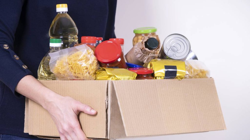 Mãos de uma voluntária segurando uma caixa de doações de alimentos com produtos alimentícios – Créditos: depositphotos.com / Vejaa