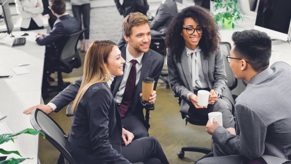 Jovens empresários multiétnicos, sorridentes e profissionais, segurando bebidas e conversando no escritório – Créditos: depositphotos.com / AllaSerebrina