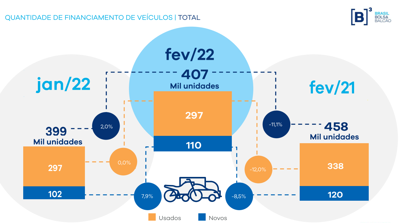 São Paulo, 11 de março de 2022 – As vendas financiadas de veículos em fevereiro de 2022 somaram 407 mil unidades, entre novos e usados, de acordo com dados da B3. O número, que inclui autos leves, motos e pesados em todo o País, representa queda de 11% se comparado a fevereiro de 2021, quando os financiamentos de veículos somaram 458 mil unidades, e aumento de 2% em comparação a janeiro de 2022.