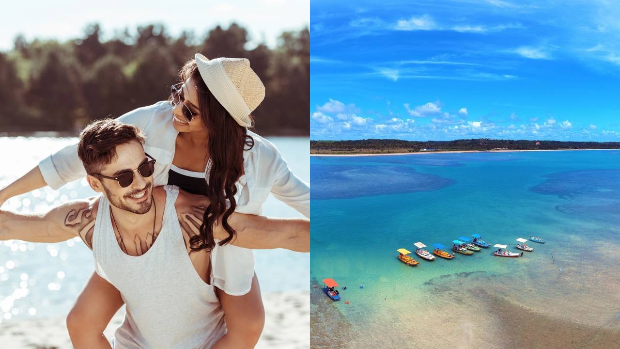 Vista aérea da Praia de São Miguel dos Milagres, Alagoas, Brasil: experiência única de nadar com peixes em piscinas naturais e Casal jovem e feliz na praia - Créditos: depositphotos.com / AllaSerebrina - Créditos: depositphotos.com / Cristian_Lourenco