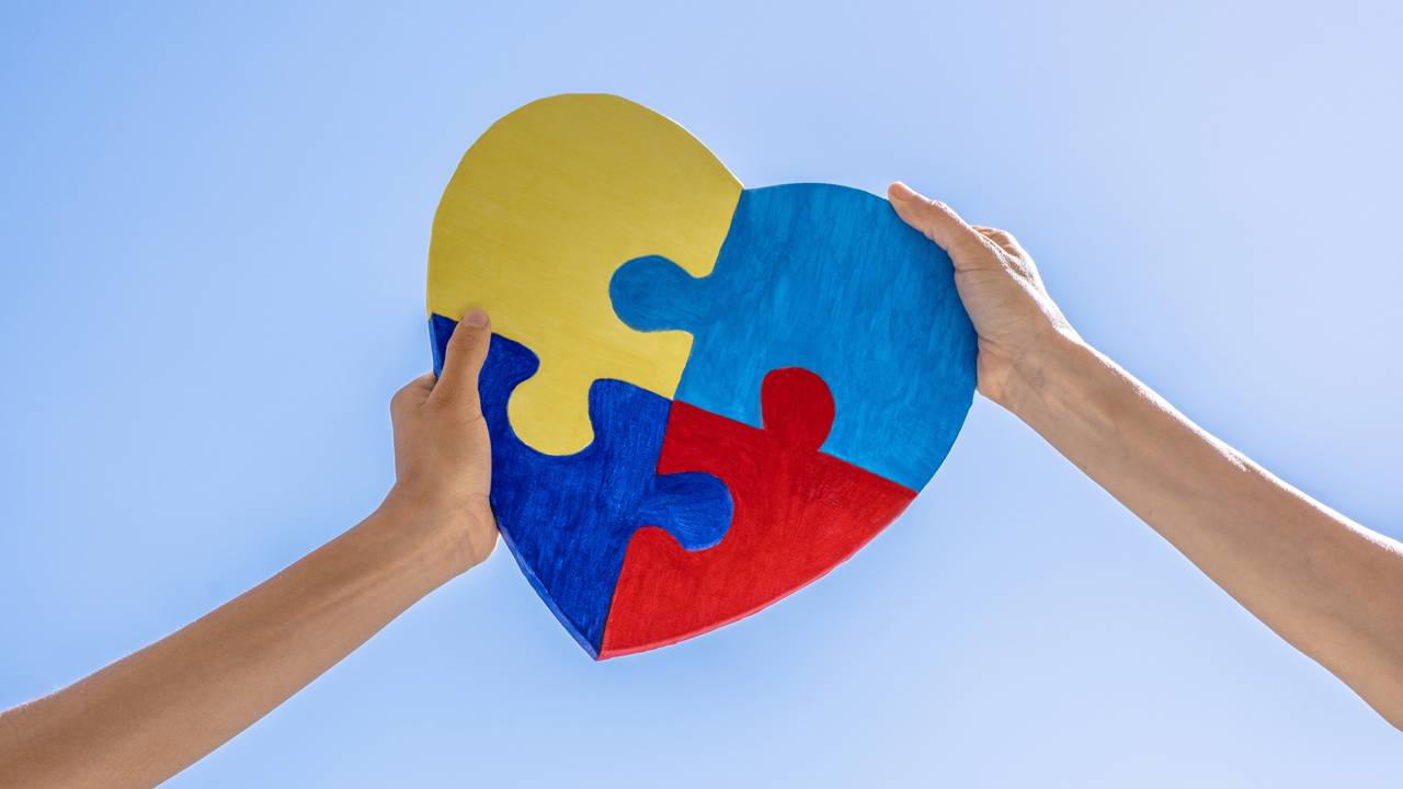 Dia Mundial da Conscientização do Autismo, conceito de Transtorno do Espectro Autista. Mãos de adulto e criança segurando juntas um coração colorido de quebra-cabeça pintado sobre um fundo de céu azul - Créditos: depositphotos.com / Vejaa