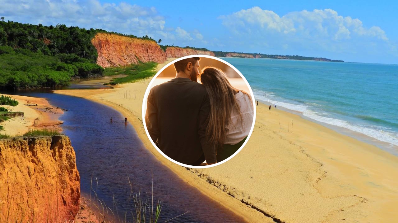 Vista aérea de Cumuruxatiba, Prado, Porto Seguro, Bahia, Brasil e Bela foto de um casal bonito sentado apreciando o pôr do sol perto de um lago da cidade - Créditos: depositphotos.com / Cristalov - Créditos: depositphotos.com / Cristian_Lourenco