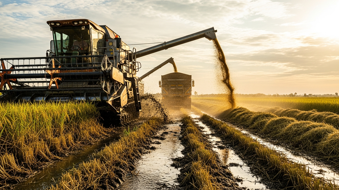 Para otimizar o tempo, o arroz é transferido para caminhões graneleiros em movimento, sem que a colheita precise parar. Imediatamente após, o produto passa por secagem industrial para reduzir a umidade de 25% para 12%, garantindo armazenamento seguro.