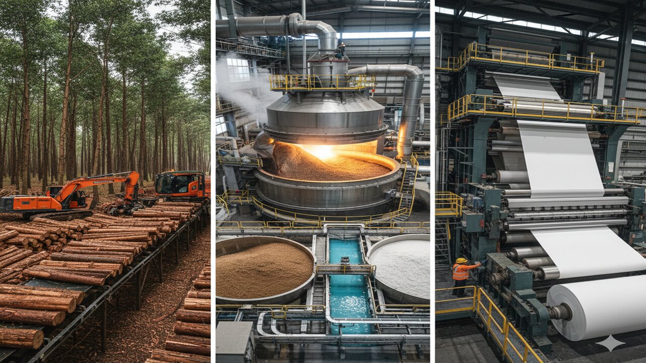 O processo começa na floresta, com o corte de árvores, geralmente eucalipto ou pinus. Os troncos são descascados e picados em pequenos cavacos, que são enviados para um digestor gigante, onde são cozidos com produtos químicos sob alta pressão e temperatura para separar as fibras de celulose da lignina (a “cola” da madeira).