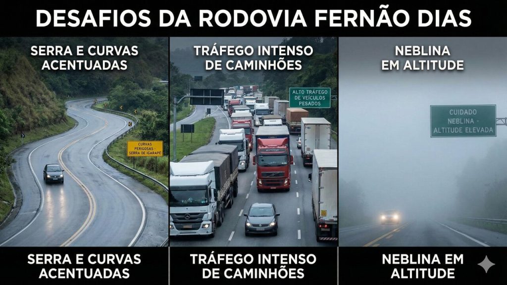 Mesmo duplicada, a Fernão Dias ainda exige muita atenção dos motoristas. O principal desafio é o seu traçado sinuoso em trechos de serra, como a Serra de Igarapé em Minas Gerais, que demandam velocidade reduzida e cuidado nas curvas.