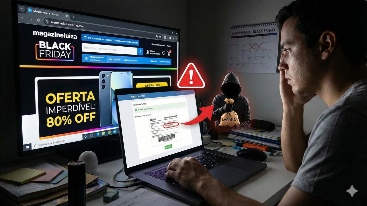 Em épocas de grandes promoções, como a Black Friday, explode o golpe do site clonado, uma fraude em que criminosos criam uma página idêntica à de grandes varejistas como Magazine Luiza ou Casas Bahia. A oferta é irresistível, o site é perfeito, mas o pagamento do boleto vai direto para um CPF de laranja.