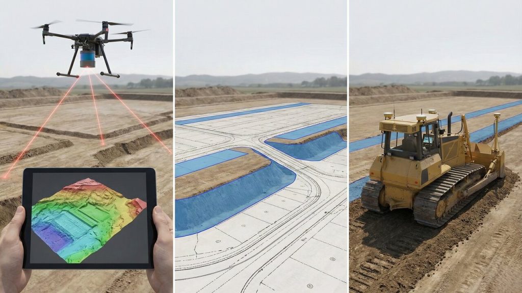 A grande revolução na terraplenagem foi a introdução do GPS de alta precisão (RTK) e de outros sistemas de automação nas máquinas. Com essa tecnologia, o operador de uma escavadeira ou um trator de esteiras vê em uma tela dentro da cabine o projeto 3D e a posição exata da lâmina ou da caçamba.