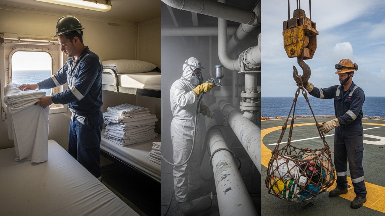 A função de Taifeiro Marítimo é uma das portas de entrada mais acessíveis, exigindo apenas o ensino fundamental e cursos básicos de qualificação em hotelaria e segurança. Esse profissional cuida da alimentação, higienização das cabines e organização geral, recebendo salários turbinados por bônus de confinamento e periculosidade. Além disso, o Auxiliar de Plataforma atua na movimentação de cargas no convés, uma função braçal que oferece rápida progressão de carreira para quem demonstra dedicação e segurança.