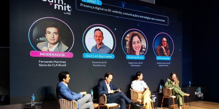 A presença digital no RI foi o tema do primeiro painel do dia, com moderação de Fernando Martinez, sócio da CLA Brasil. Participaram Catarina Bruno, supervisora de RI da Odontoprev (ODPV3); Davi Coin Bacichette, gerente de RI da Randoncorp (RAPT4); além de Ainá Guimarães, da Iochpe-Maxion.