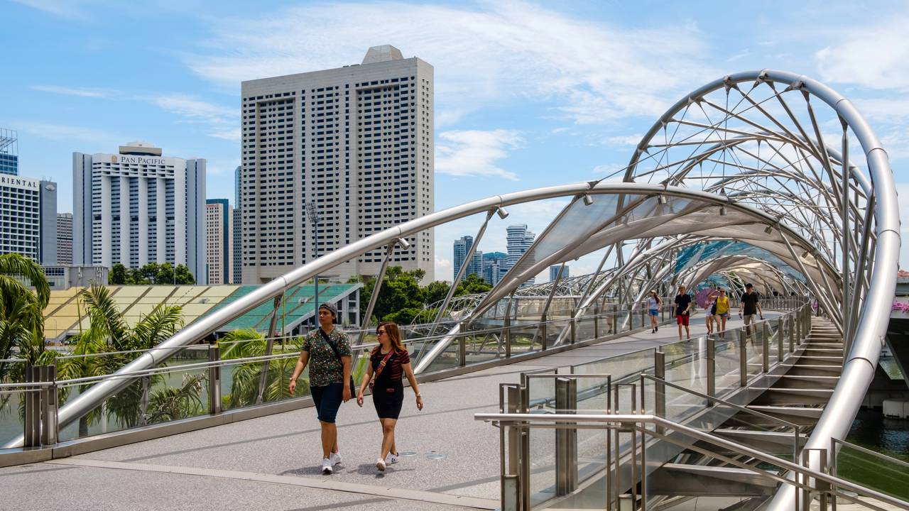 A Helix Bridge é um marco da arquitetura moderna em Singapura, destacando-se por seu design em dupla hélice. Com 280 metros de extensão, a estrutura conecta o Marina Centre ao Bayfront, simbolizando renovação e continuidade.