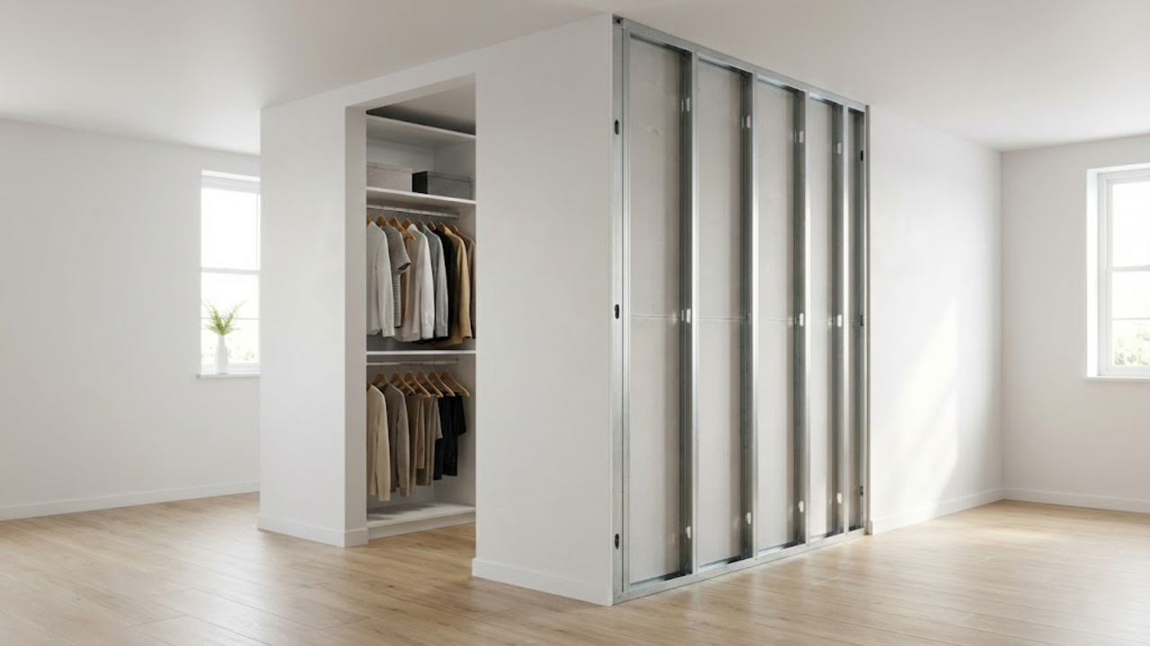 Um erro comum é aparafusar cabideiros e gavetas direto no gesso, o que causa rachaduras ou quedas com o peso das roupas. O segredo é instalar sarrafos de madeira por dentro da estrutura metálica nos pontos onde você pretende fixar suportes pesados.