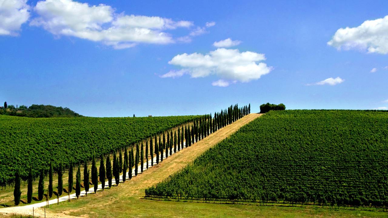 Embora os ciprestes sejam perenes e mantenham o verde o ano todo, a primavera oferece campos floridos e temperaturas agradáveis para passeios ao ar livre. O outono também é especial devido à colheita das uvas e às festividades gastronômicas locais.