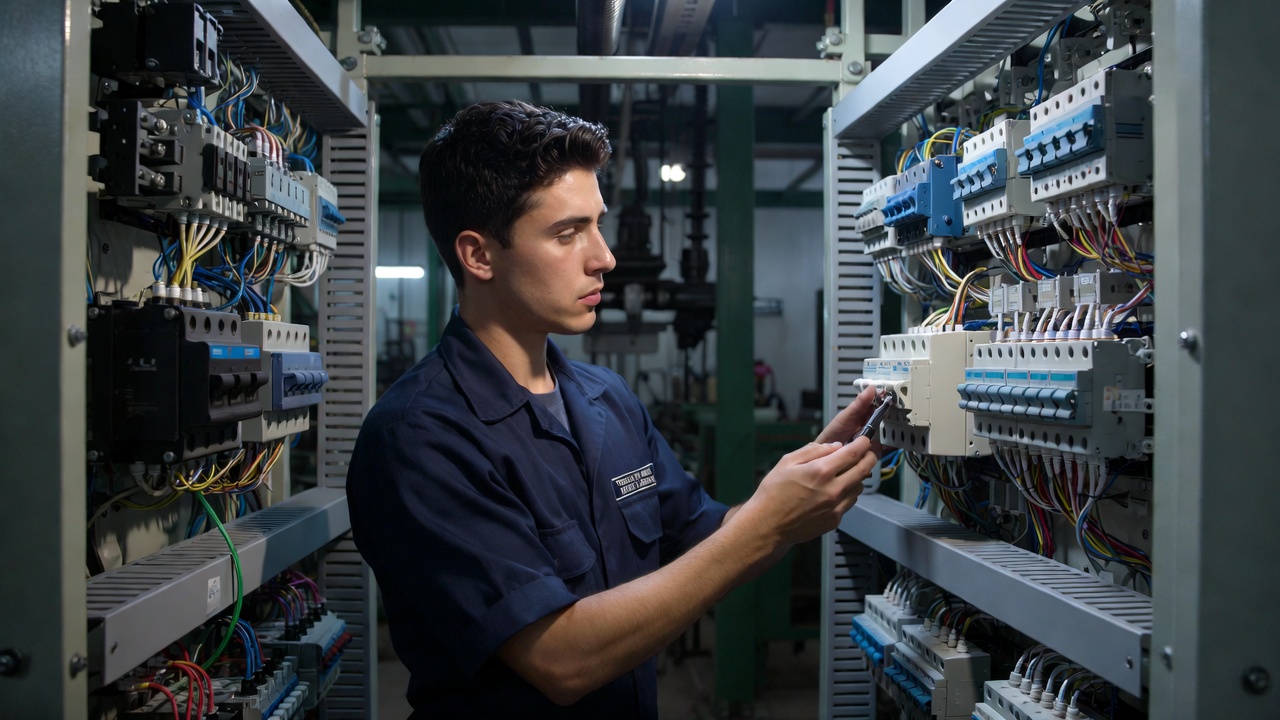 O eletricista de alto nível foca em montar quadros de comando enormes e programar máquinas que cortam metais sozinhas no galpão iluminado. A rotina exige a leitura atenta de esquemas elétricos em formato de desenho para achar falhas invisíveis a olho nu. O uso de luvas isolantes grossas blinda o corpo contra choques severos de alta tensão nas paradas de manutenção preventiva.