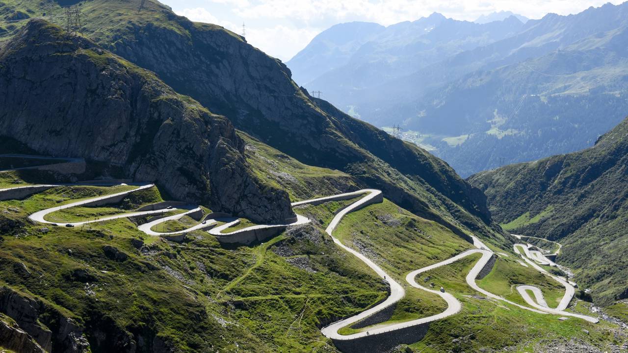 O Gotthard Pass é uma das passagens de montanha mais lendárias da Suíça, atingindo 2.106 metros de altitude. A grande atração é a Via Tremola, uma estrada cujas curvas sinuosas de paralelepípedos serpenteiam os Alpes com uma pavimentação milenar.