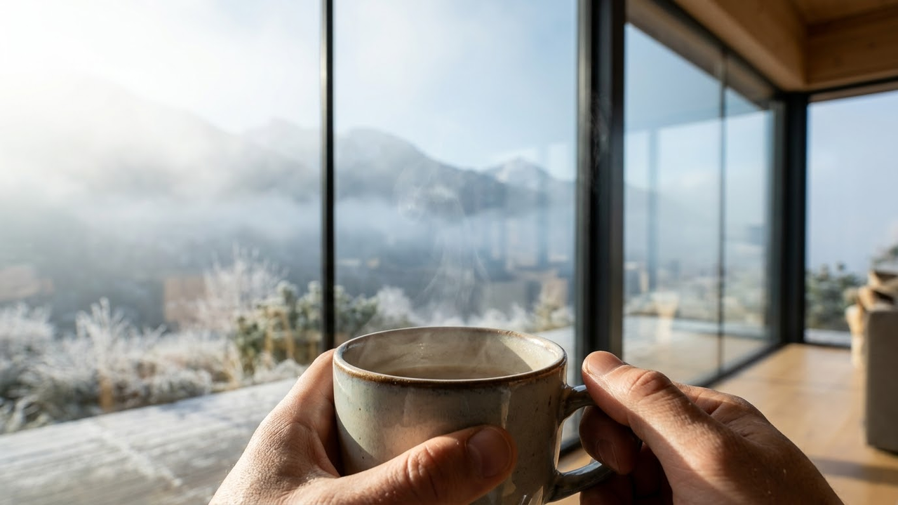 A instalação de amplos painéis transparentes que vão da base até o topo cria uma integração absoluta entre o interior aconchegante e o meio ambiente. Essa barreira invisível protege os moradores do vento cortante de inverno sem bloquear a entrada vital da iluminação natural diária.