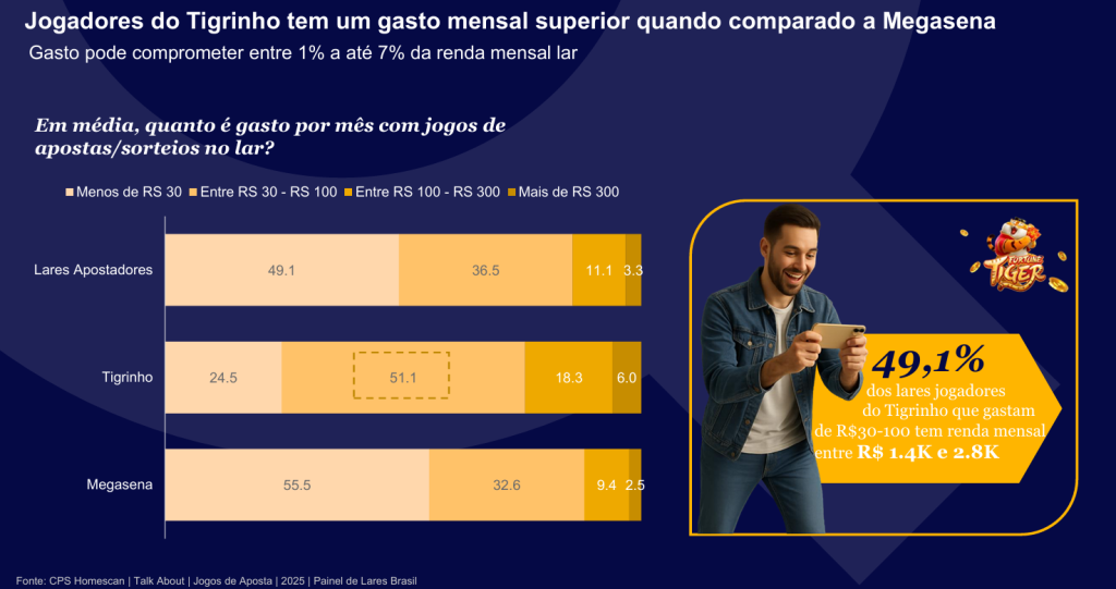 Segundo a NielsenIQ, o impacto das apostas no consumo mostra que a intensidade do gasto varia conforme o tipo de jogo. Enquanto 55,5% dos apostadores da Mega-Sena gastam menos de R$ 30 por mês, a maioria de usuários do Jogo do Tigrinho diz gastar entre R$ 30 e R$ 100 mensalmente com o jogo.