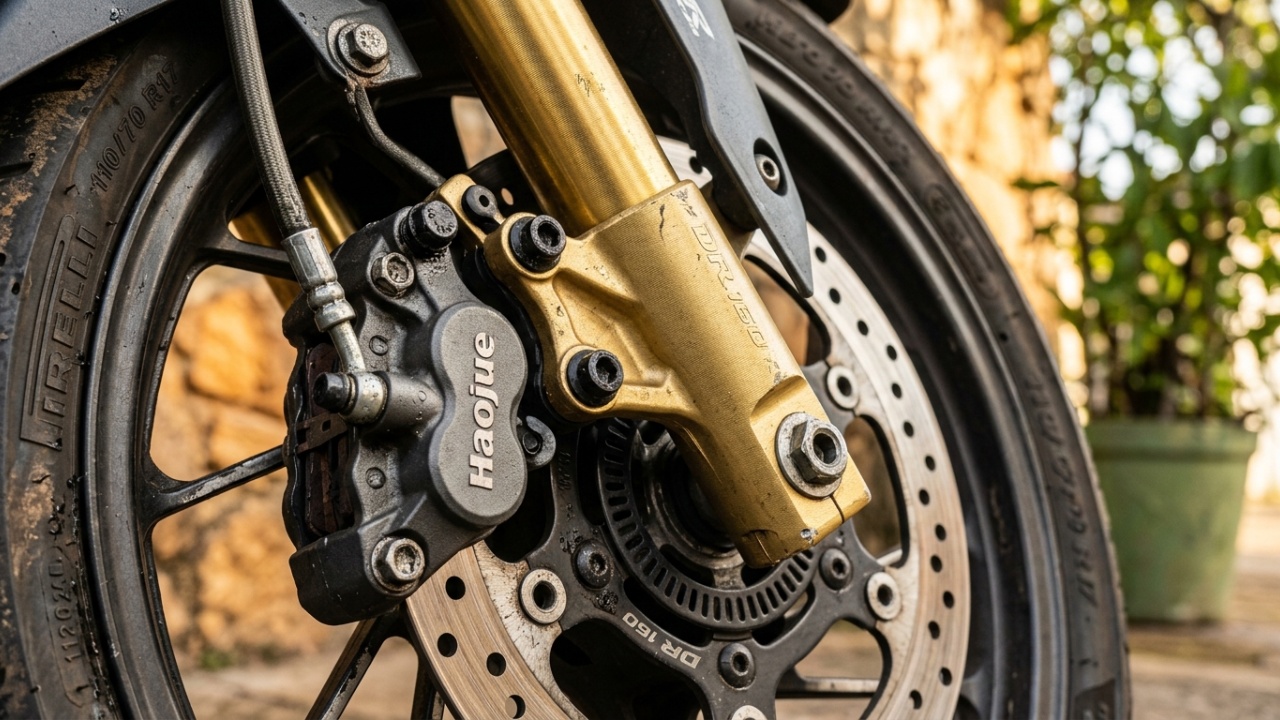 A enorme maioria das motos urbanas de 160 cilindradas utiliza garfos telescópicos convencionais na dianteira. A nova Haojue inova profundamente ao trazer a suspensão invertida, um item de série valioso que geralmente fica restrito aos modelos premium e de pista.